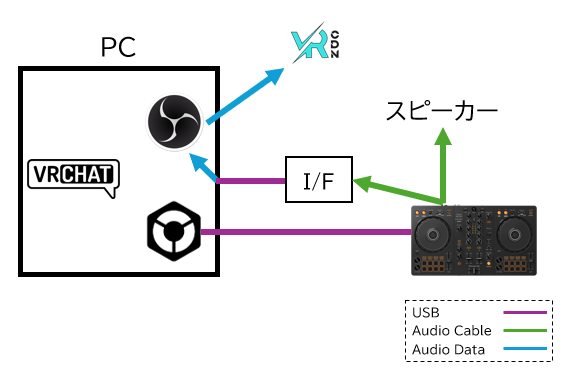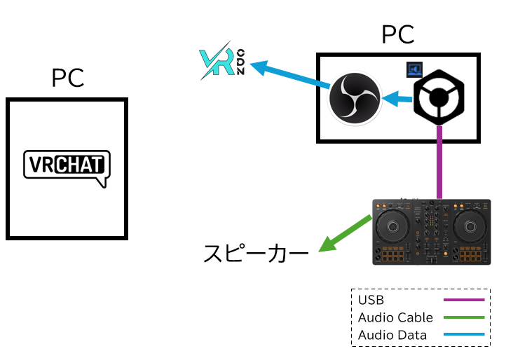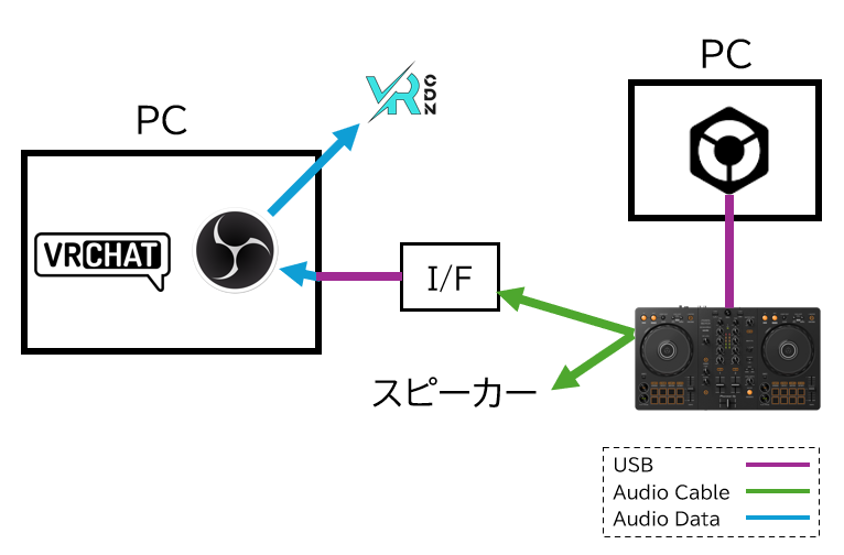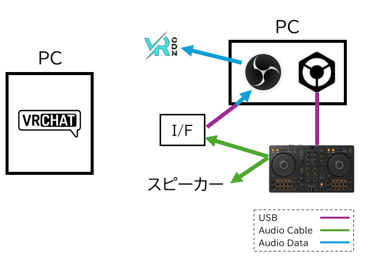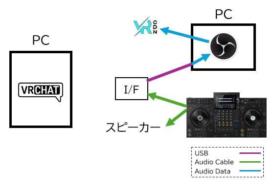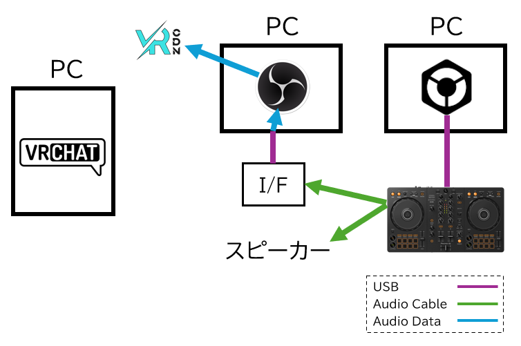 I/FありPCDJまたはCDJ/XDJでPRO DJ LINK使用時に、VRChatとrekordboxとOBSを全て別々のPCで動かす理想構成。