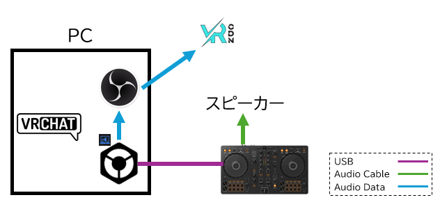 環境としては『rekordbox(またはCDJ/XDJ)の音をOBSに取り込み、VRCDN経由でVRChatに流す』ことを想定する。他プラットフォームの場合は適宜置き換えてほしい。